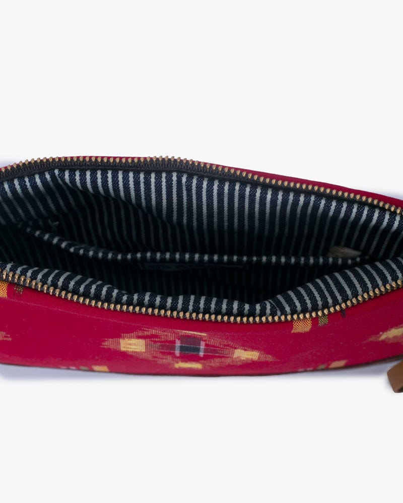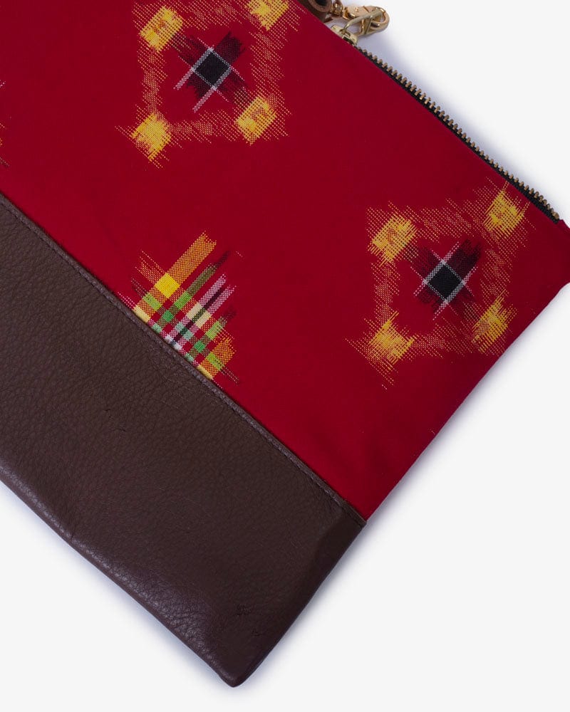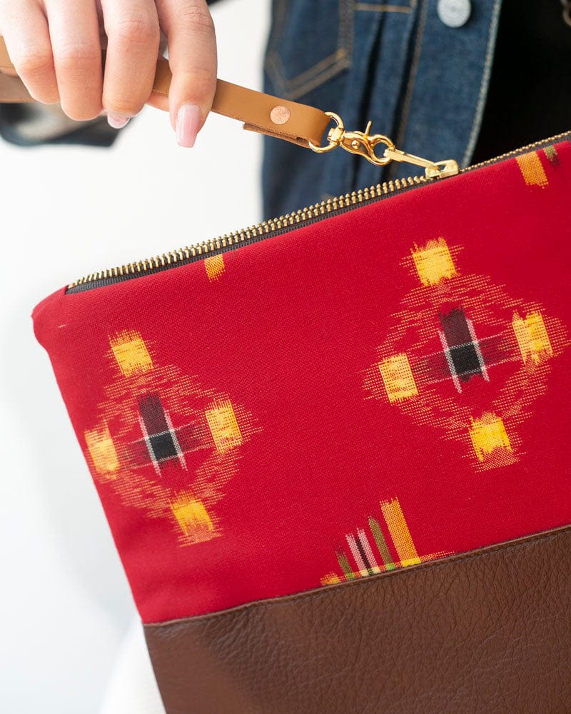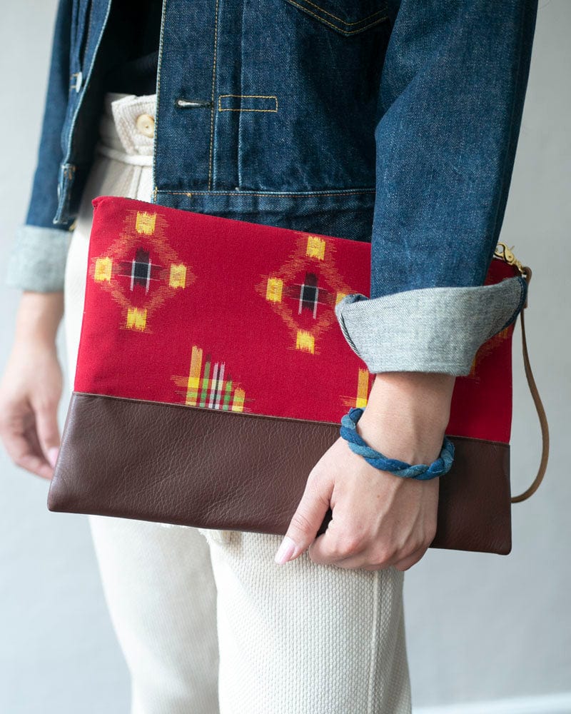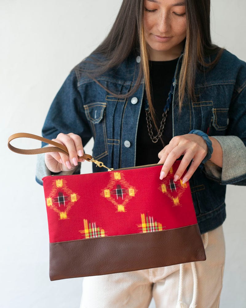 Our clutch bags feature vintage Japanese kimono fabrics paired with high quality US sourced leather. Clutch bag quantity is limited as these kimono fabric bolts are one of a kind. Each piece is sewn in Portland, with US made brass zippers and lined with rail stripe canvas. The outer tab can be used to keep your essentials easily accessible.